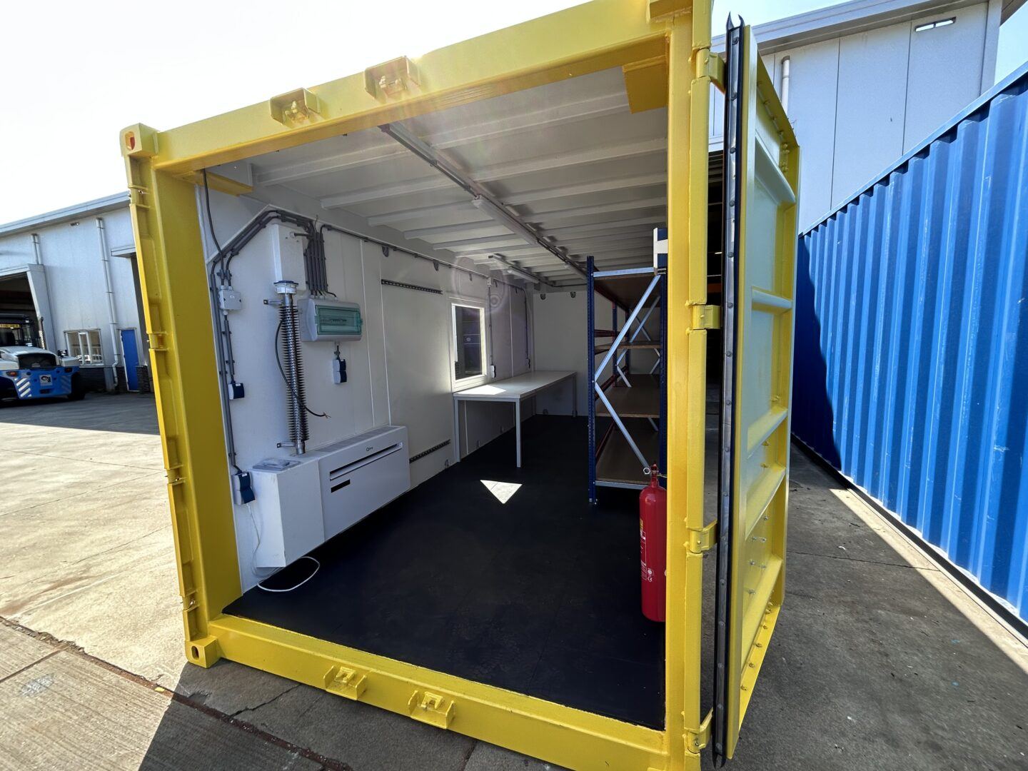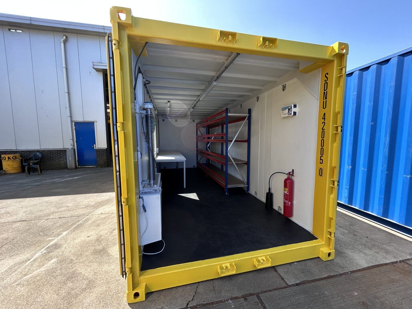 The interior of the container has been enriched with a window that not only lets in daylight, but also contributes to a more pleasant working environment. In addition, a work table and custom-made shelving have been installed, both improving on-board organisation. Furthermore, built-in electric lighting and safety equipment, such as a first-aid kit and a CO2 fire extinguisher, ensure a safe working environment, in line with the strict safety requirements applicable within the offshore sector.